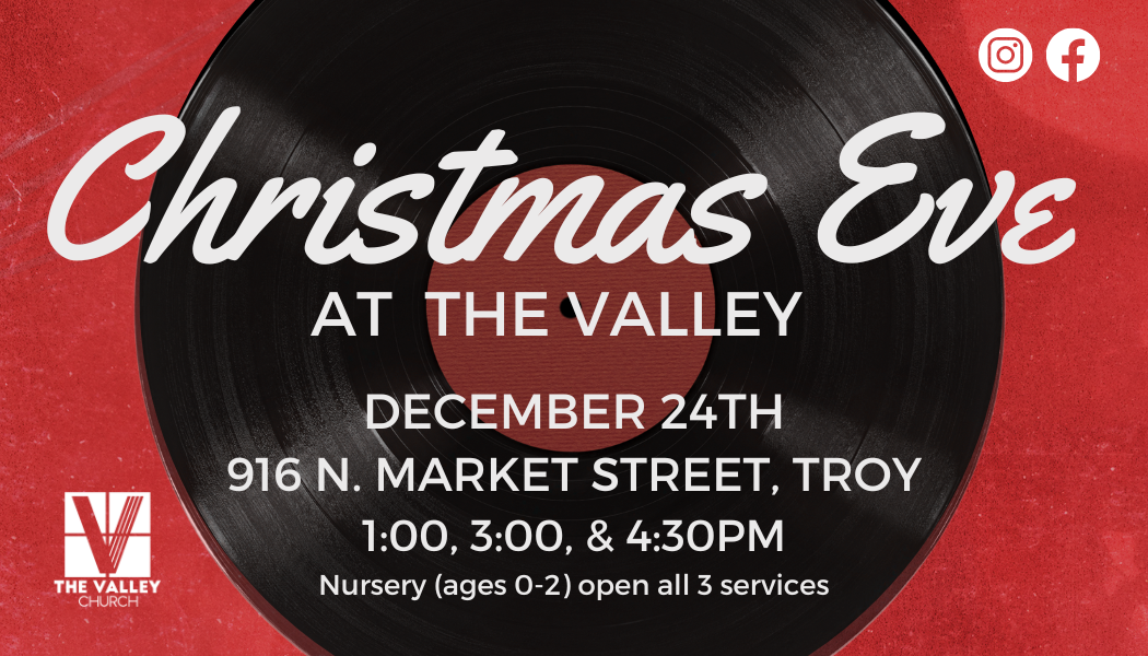 Join us for Christmas Eve at The Valley at 1:00, 3:00, or 4:30 pm on December 24th.