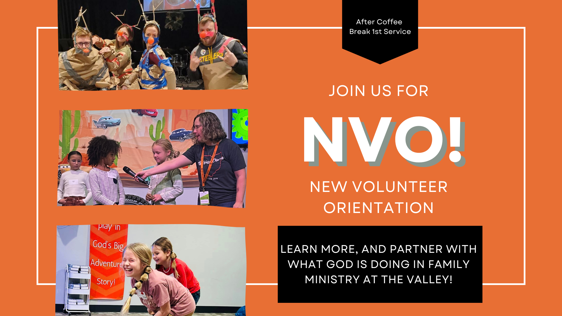 All ministry partners require a background check before serving. At N.V.O., we share the vision for Family Ministry at The Valley Church, position descriptions for each opportunity, how schedules and serving works, safety, and more.