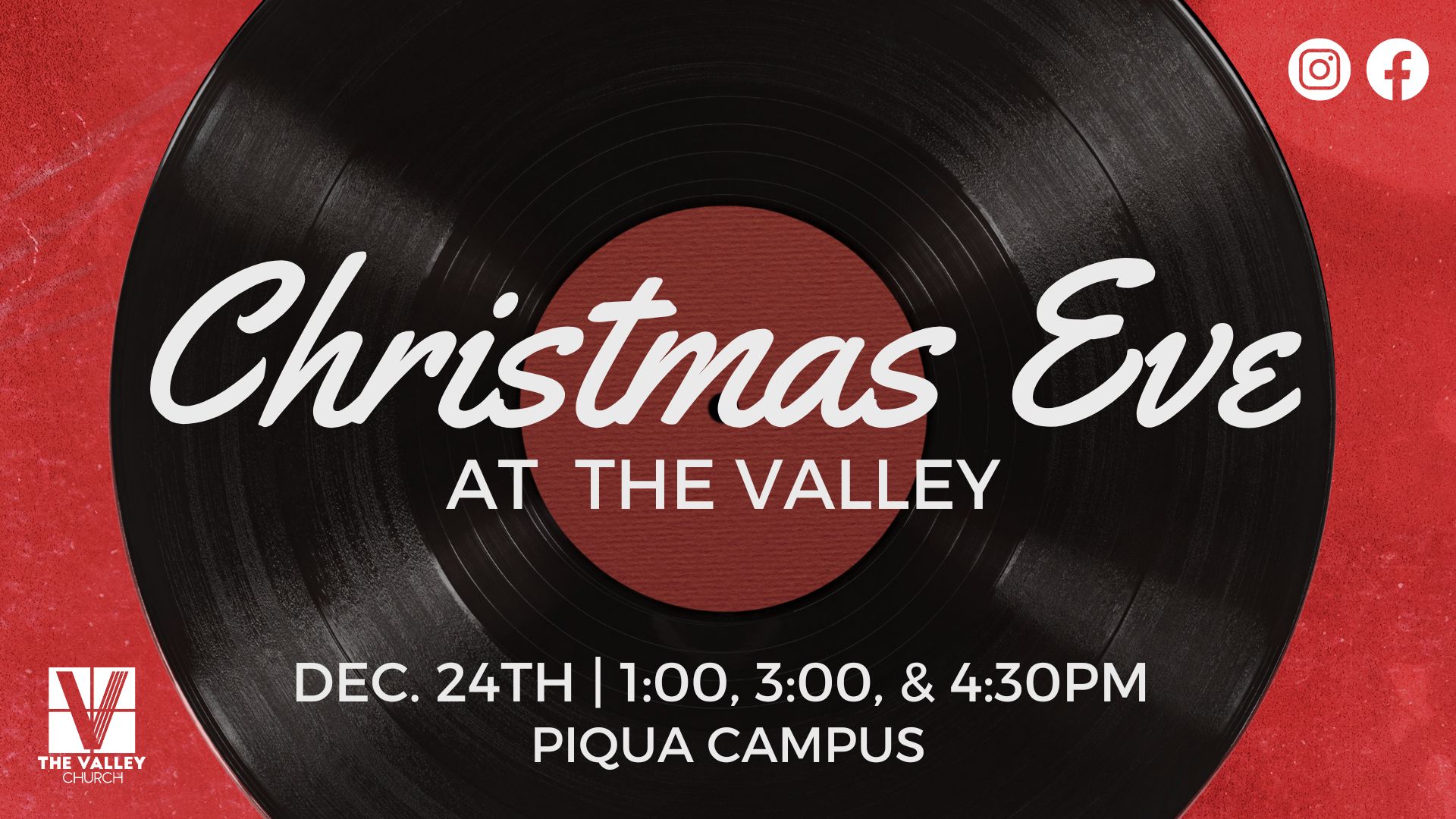 Piqua Campus 1400 Seidel Parkway, Piqua, OHJoin us for Christmas Eve at The Valley at 1:00, 3:00, or 4:30 pm on December 24th. Nursery birth - 2-year-old will be provided at all three services. Come celebrate Christmas Eve at The Valley as we explore the hope and joy behind the songs we sing every year.